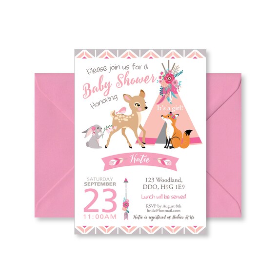 Rosa Boho Tipi Baby Dusche Einladung Madchen Rosa Und Grau Wald Tiere Laden Tipi Federn Pfeile Boho Dusche by etsy.com