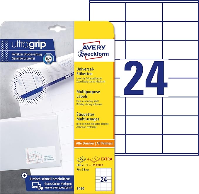 Avery Zweckform 3490 Adressaufkleber A4 Mit Ultragrip 70x36 Mm 30 Blatt Papier Matt Bedruckbare Selbstklebende Adressetiketten 720 by amazon.de