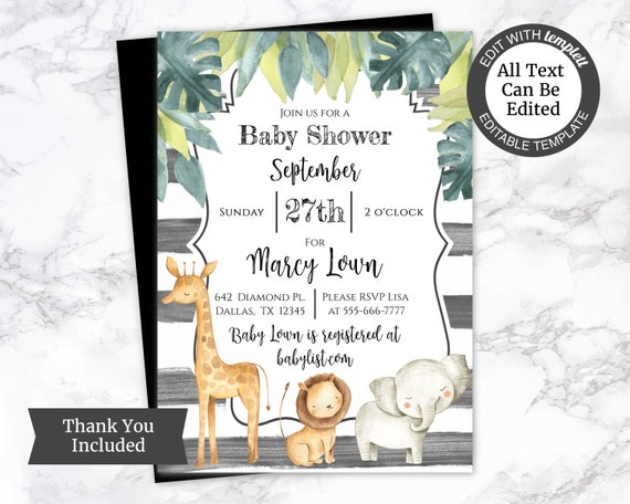 Dschungel Safari Baby Dusche Einladung Vorlage Safari Dusche Laden Dschungel Tier Laden Elefanten Baby Dusche Einladen Geschlechtsneutral by etsy.com