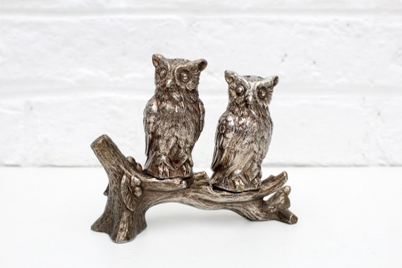 Vintage Silber Metall Salz Und Pfefferstreuer Zwei Eulen Auf Einem Ast Seine Und Ihre Eule Housewarminggeschenk Gewurz Eule H 4 1 In 10 5 Cm by etsy.com