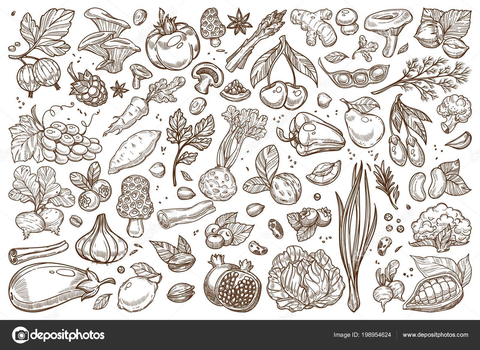 Obst Und Gemuse Monochrom Sepia Skizziert Grossen Satz by de.depositphotos.com